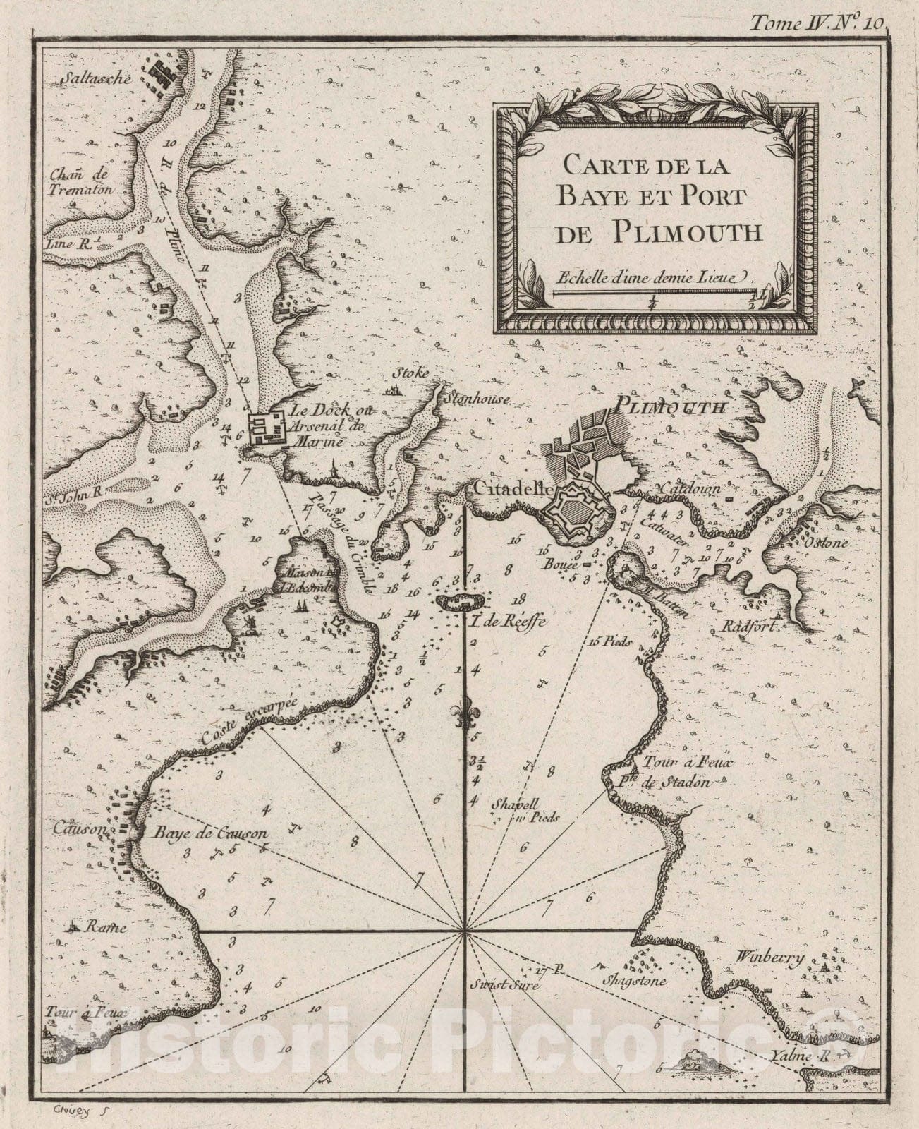 • .Historic Map : England, , Europe 1764 Carte de la Baye et Port de Plimouth , Vintage Wall Art