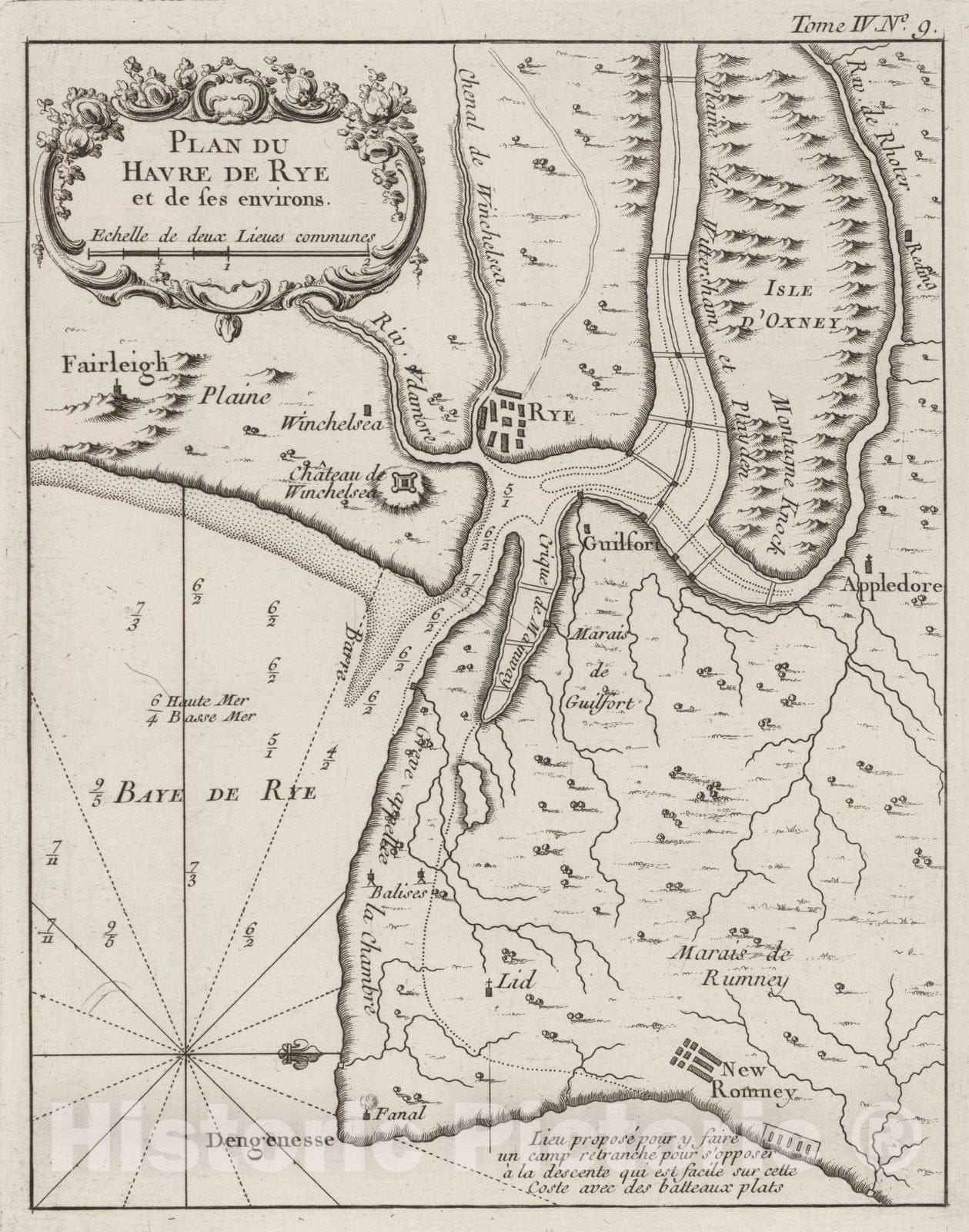 Historic Map : England, , Europe 1764 Plan du havre de Rye et de ses Environs , Vintage Wall Art