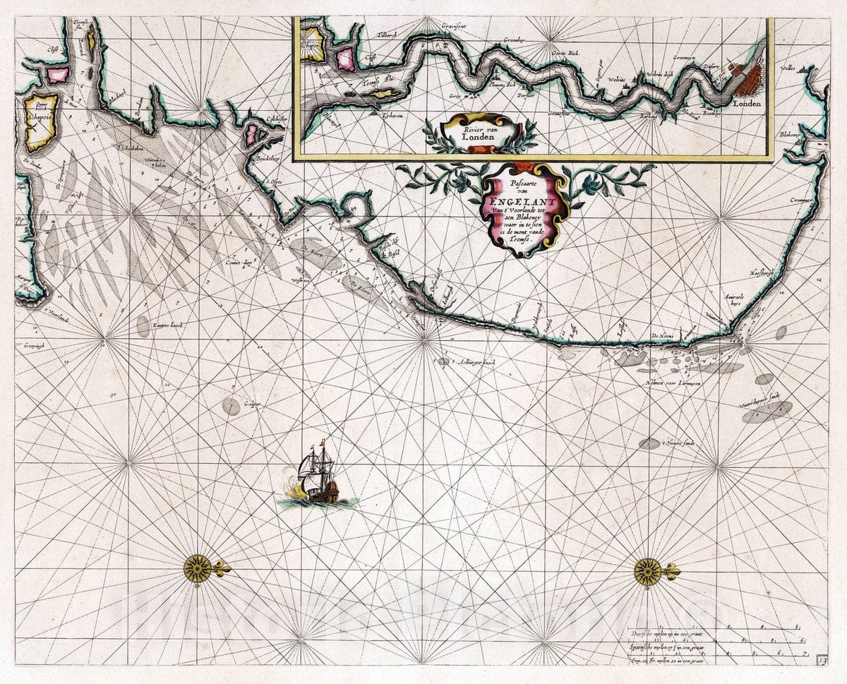 England, North Sea 1667 Pascaarte van Engelant. , Vintage Wall Art