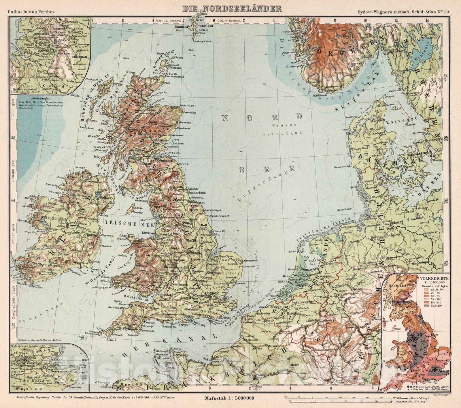 No. 30. Die Nordseelander. | Sydow-Wagners Methodischer Schul-Atlas. Entworfen, Bearbeitet und Herausgegeben von Hermann Wagner. 63 Haupt- und 50 Nebenkarten auf 47 Tafeln. Neute, Berichtigte und Erganzte Auflage. Preis: Gebunden 5 Mark = 6 Kronen. Gotha: Justus Perthes. 1902. | Maps in full color with most relief depicted as a combination of hypsometric tints and hachures.
