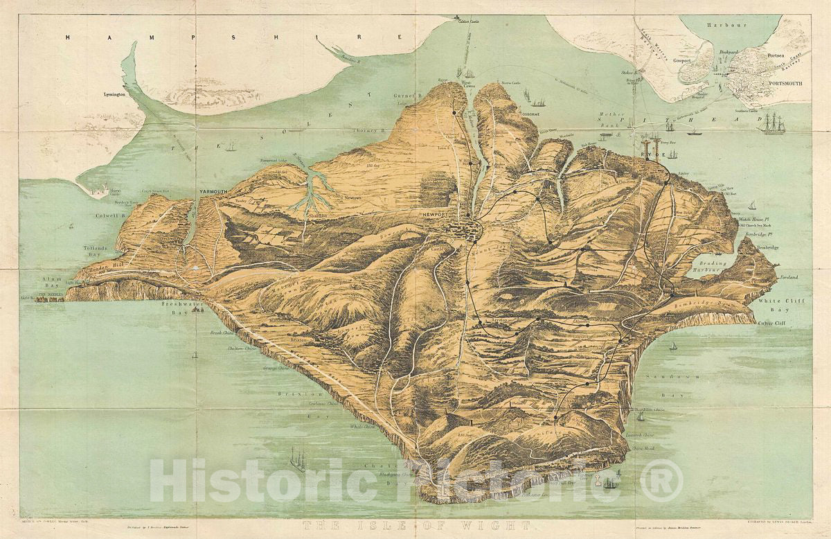 This is a beautiful c. 1870 bird's eye view of the Isle of Wight, England. It features the largest island of England located in the English Channel and separated from mainland Great Britain by the Solent. Notes roads, towns, rivers, railways, ferry lines and beautifully rendered topography. Ships can be seen sailing along the coast. Gosport and Portsmouth city and harbor are also noted.