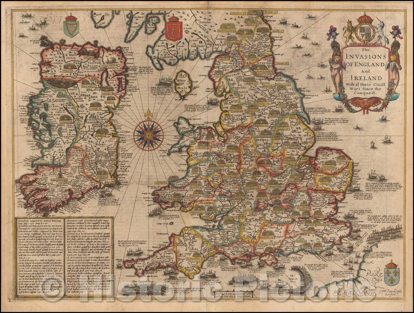 Historic Map - The Invasions of England and Ireland with al their Civill Wars Since the Conquest, 1651, John Speed - Vintage Wall Art