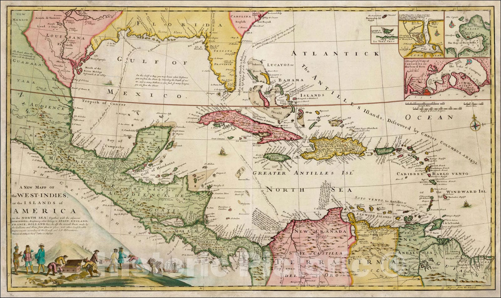 A New Mapp of the West-Indies, or the Islands of America in the North Sea; Explaining what belongs to Spain, England, France, Holland, 1740