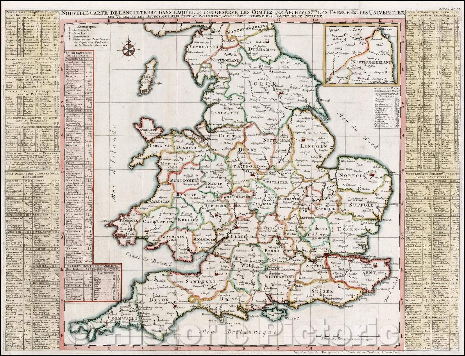 • .Historic Map - Nouvelle Carte De L'Angleterre Dans Laqu'elle L'on Observe Les Cmtez Les Archeves/Map of England, colored by Counties, 1719, Henri Chatelain - Vintage Wall Art