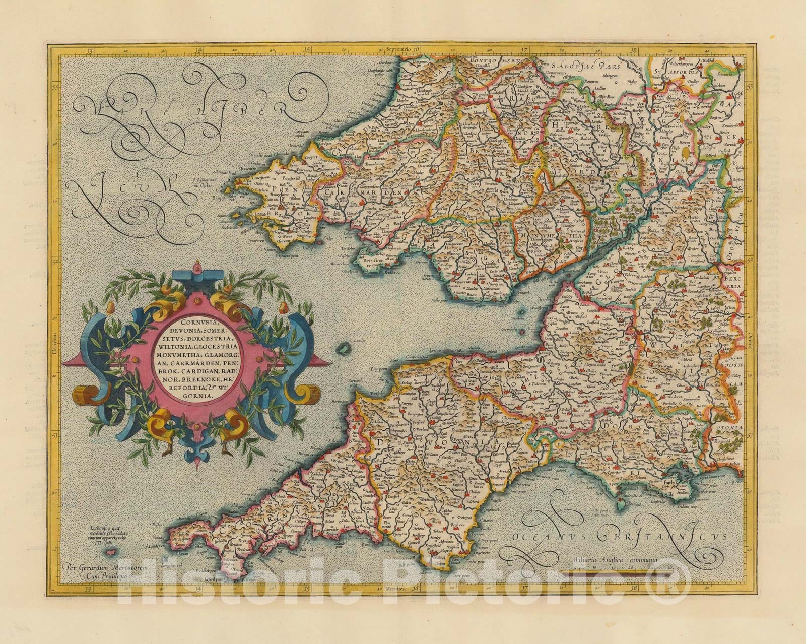 Historic Map - Southwestern England, Cornwall, Devon, Sommerset, Dorset, Wilton, Glouchester, Glamorgan, Caermarden, Penbroke, Cardigan, 1610 - Vintage Wall Art