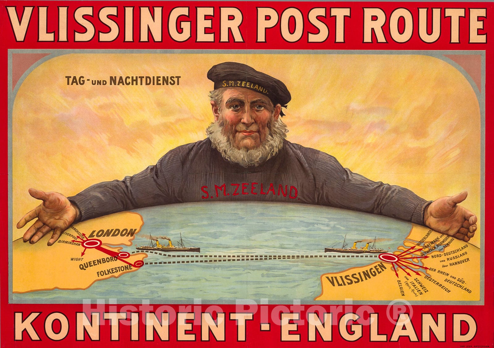 Vlissinger Post Route, Kontinent - England., 1909, Vintage Wall Decor