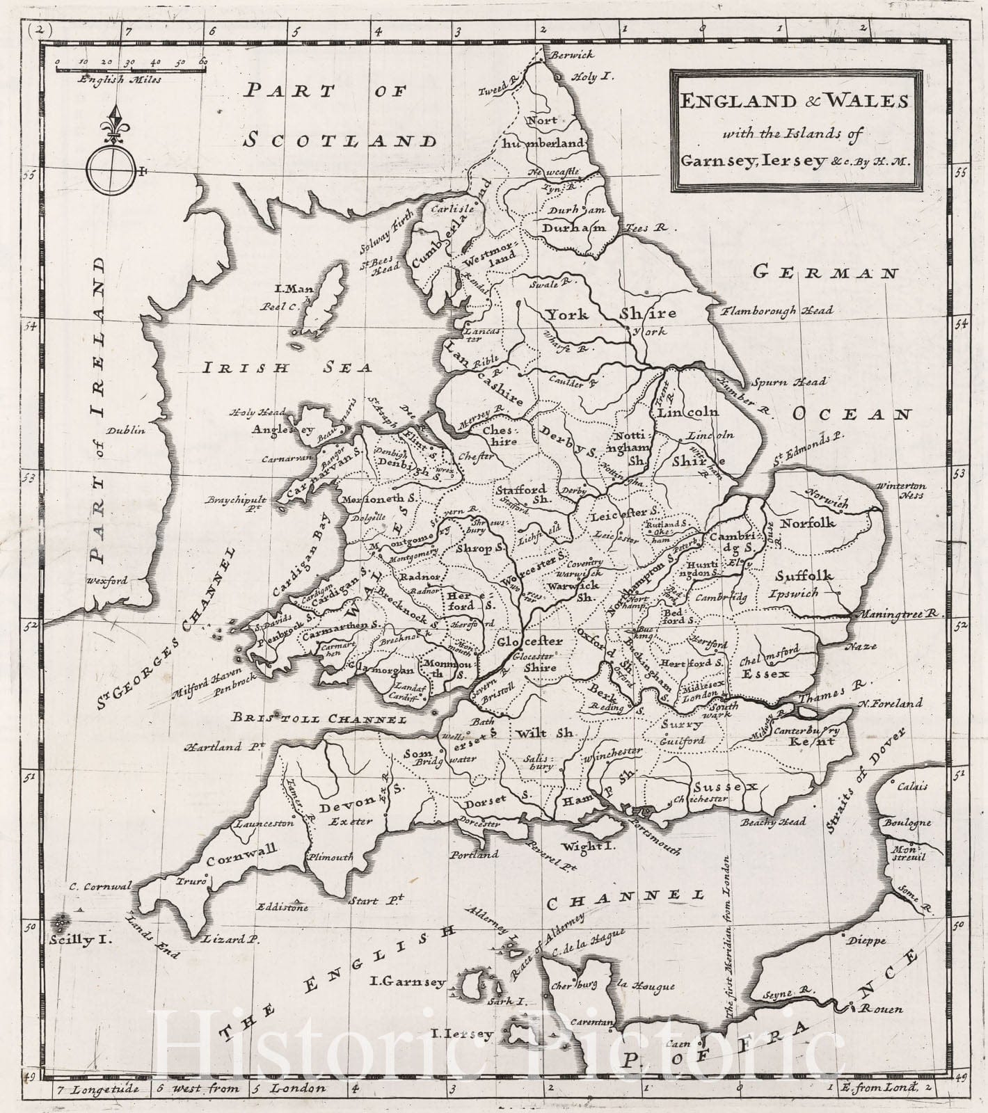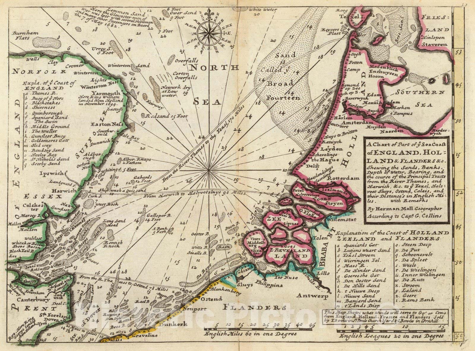 • .Historic Map : World Atlas Map, Chart of part of coast of England, Holland & Flanders &c. 1736 - Vintage Wall Art