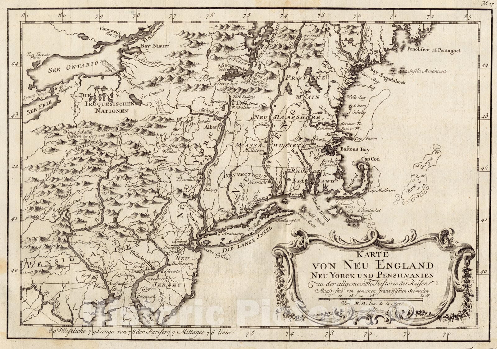• .Historical Map, 1757 Karte von Neu England, Neu Yorck und Pensilvanien : sur Allgemeinen Historie der Reisen, Vintage Wall Art