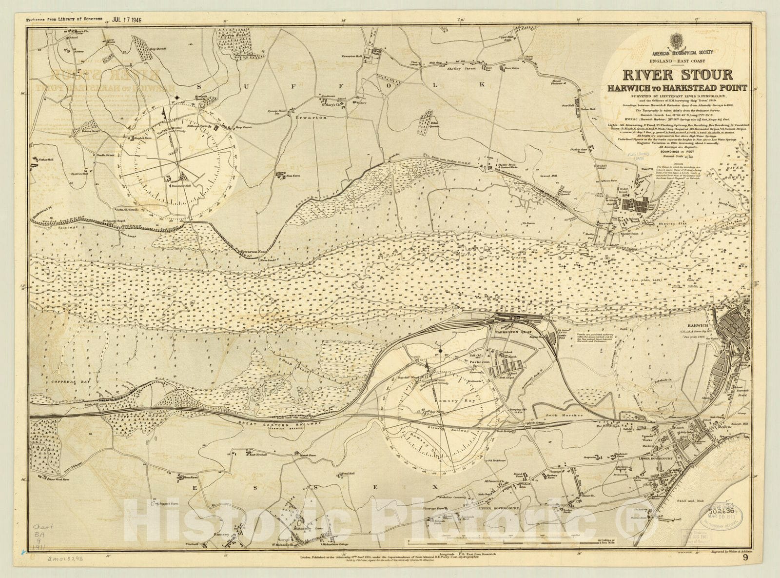 Map : East Coast of England 1911, England-East Coast, River Stour, Harwich to Harkstead Point , Antique Vintage Reproduction
