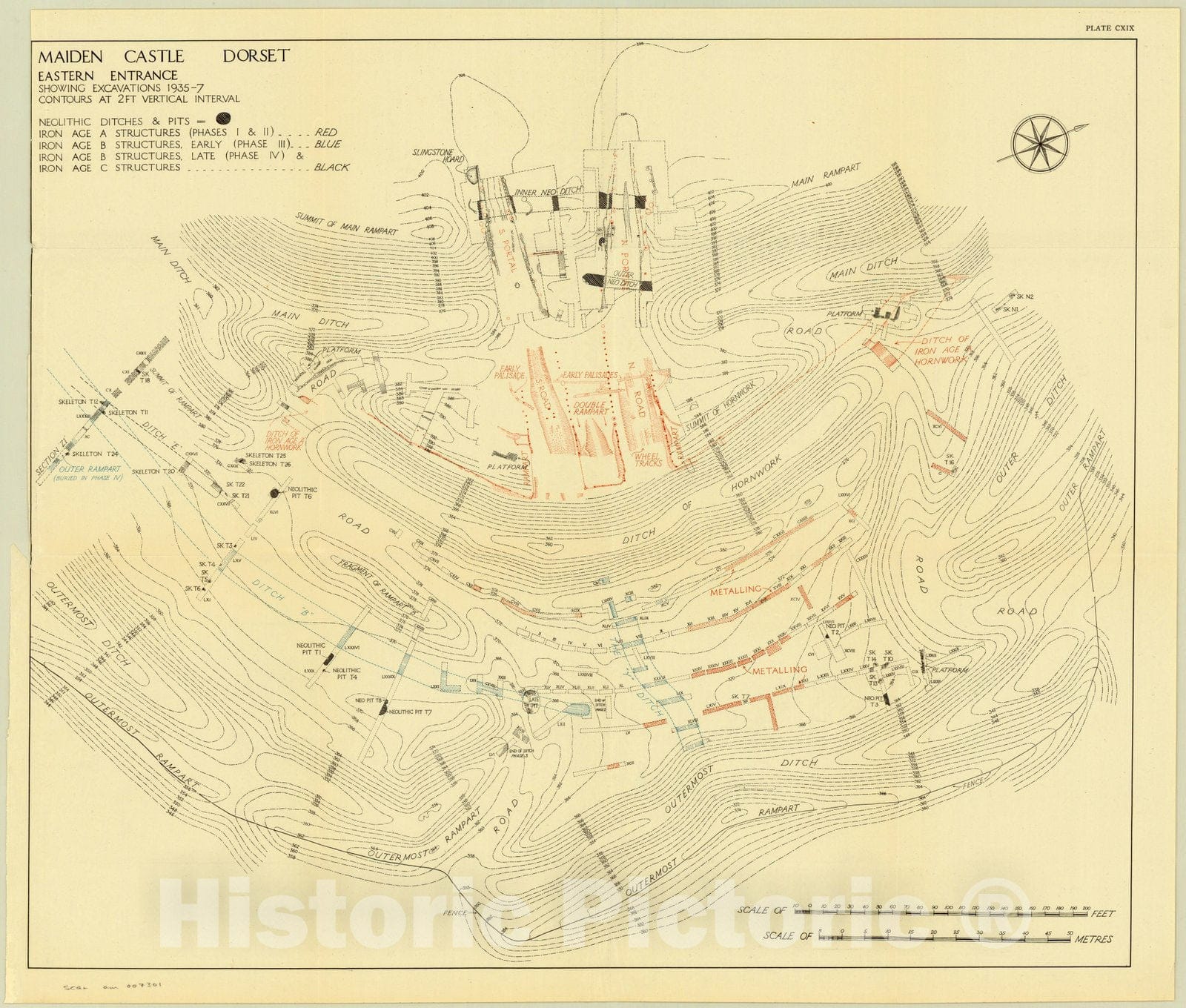 Map : Miaden Castle Dorset, England 1943, Maiden Castle Dorset, eastern entrance showing excavations 1935-7 plate CXIX, Antique Vintage Reproduction