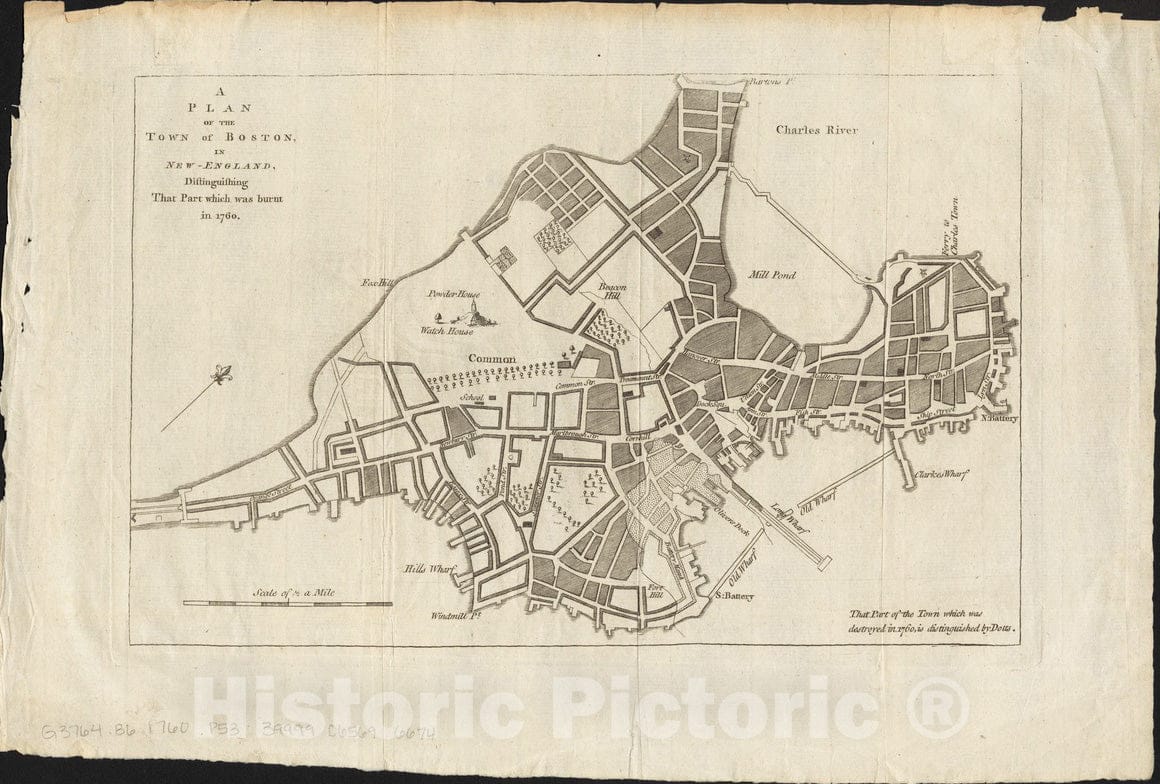 Historical Map, A Plan of the town of Boston, in New-England, distinguishing that part which was burnt in 1760, Vintage Wall Art