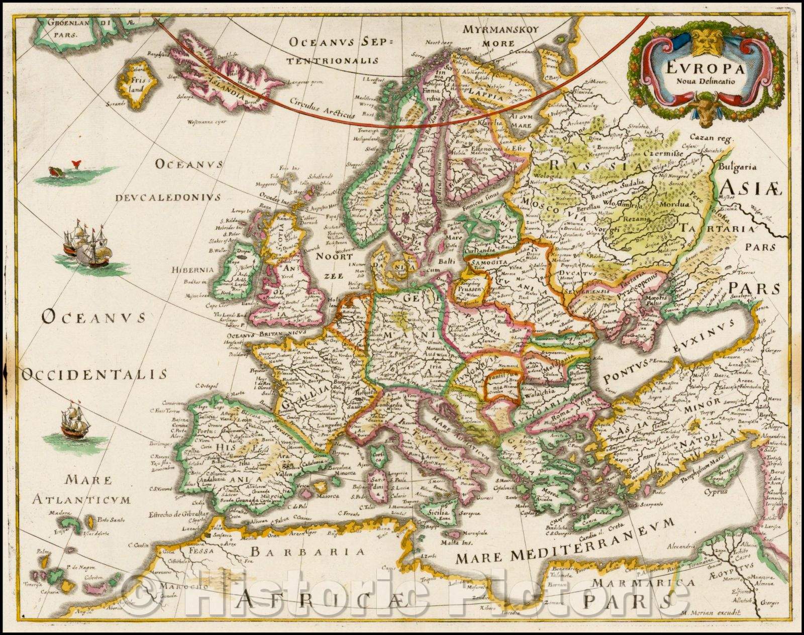 Historic Map - Europa Nova Delineatio/Map of Europe, sailings ships and a Sea monster, 1640, Matthaus Merian - Vintage Wall Art