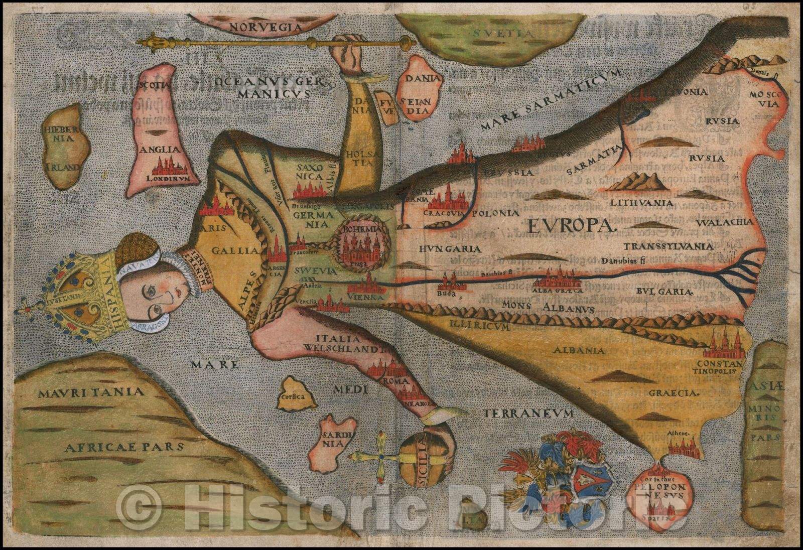 Historic Map - Europe in the Shape of a Queen, 1581, Heinrich Bunting - Vintage Wall Art