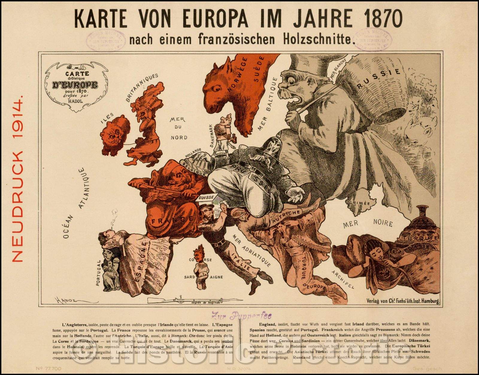 • .Historic Map - Karte Von Europa Im Jahre 1870 nach einem franzosischen Holzschnitte/Map Of Europe In 1870, after a FRENCH woodcuts, 1914, Paul Hadol - Vintage Wall Art