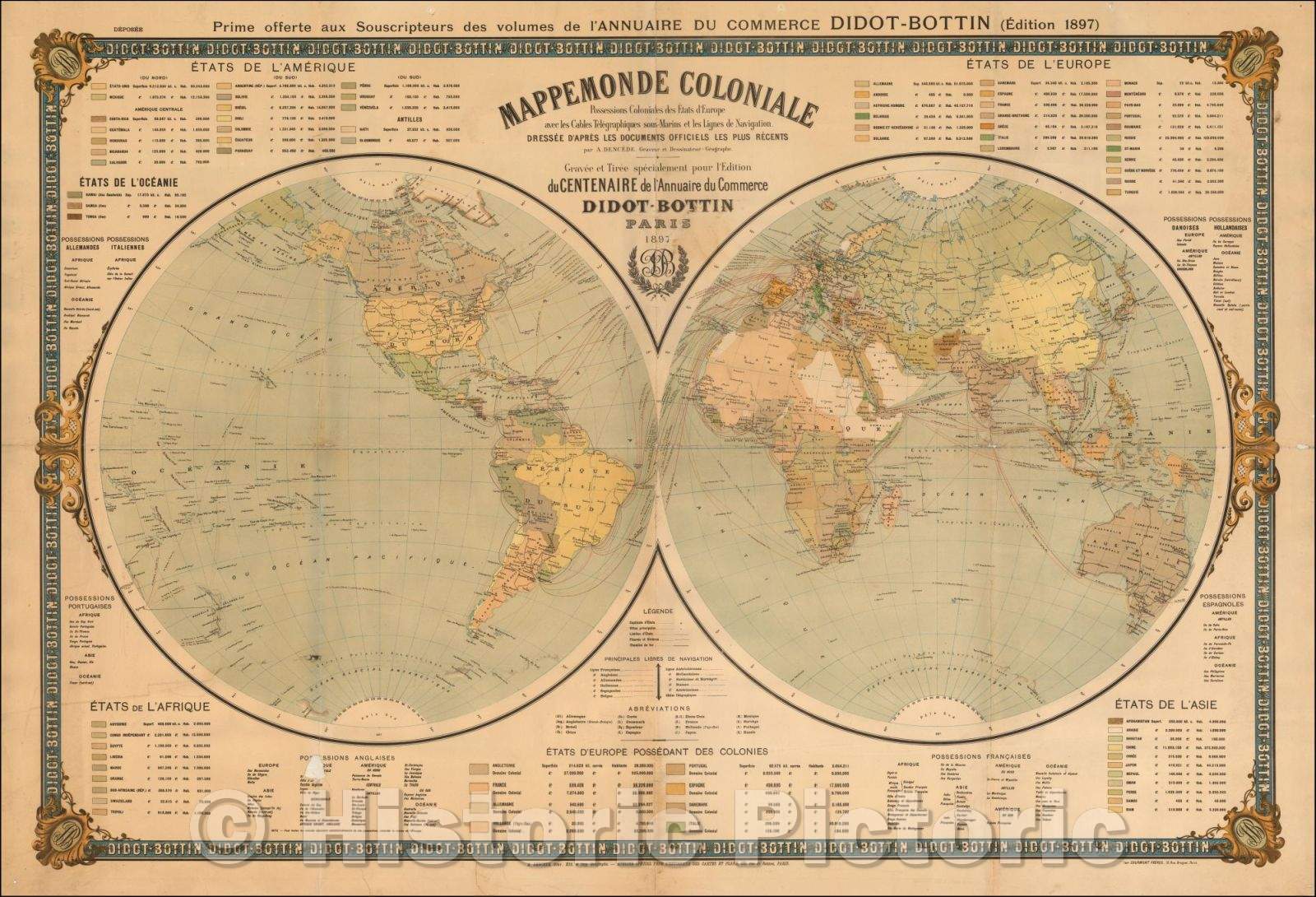 • .Historic Map - Mappemonde Coloniale Possessions Coloniales des Etats d'Europe avec/Globe Colonial Colonial possessions of the European states, 1897, C. Dencede - Vintage Wall Art