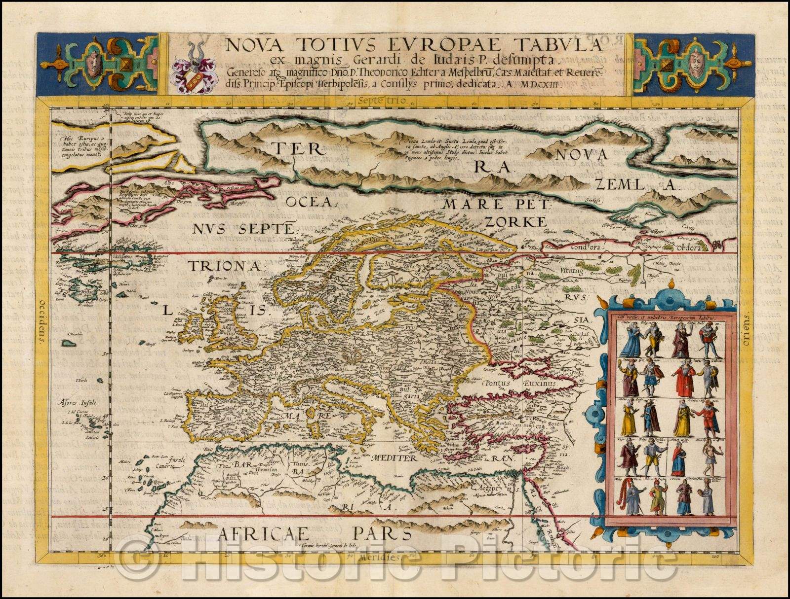 Historic Map - Nova Totius Europae Tabula ex magnis Gerardi de Iudaeris P. Desumpta/Gerard De Jode's Map of Europe, Speculum Orbis Terarrum in 1593, 1593 - Vintage Wall Art