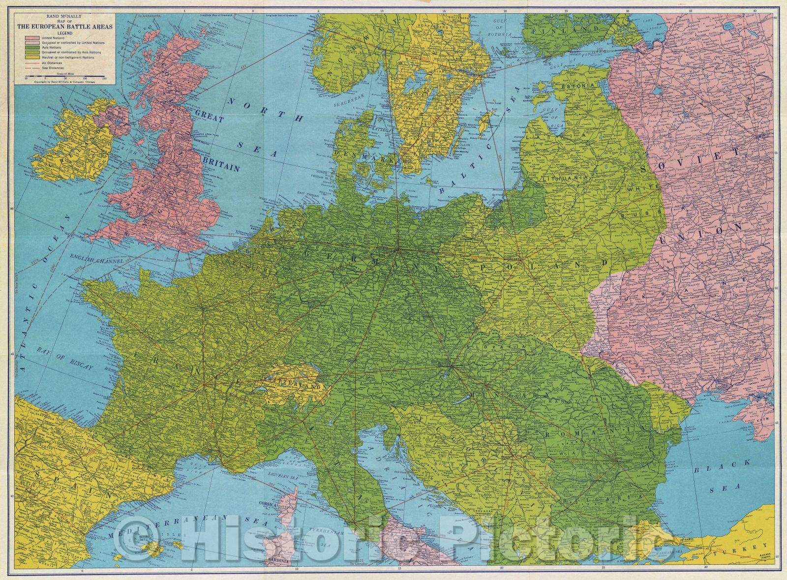• .Historic Map : Rand McNally Map of the European Battle Areas, 1944 , Vintage Wall Art