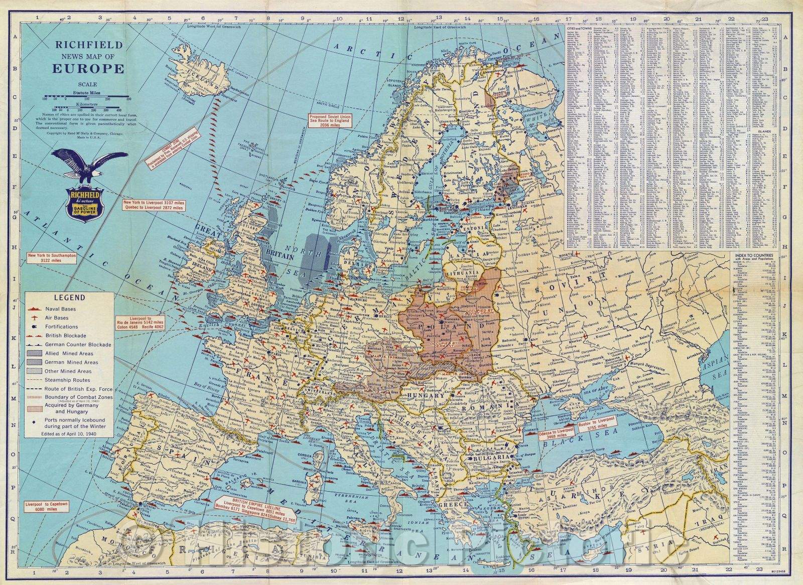 Historic Map : Richfield News Map of Europe, 1940 , Vintage Wall Art