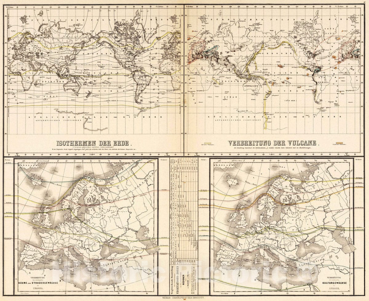 Historic Map : 1886 Isotherms of the earth. Spreading of the Volcanos. Trees and bush plants in Europe. Cultural plants in Europe. - Vintage Wall Art