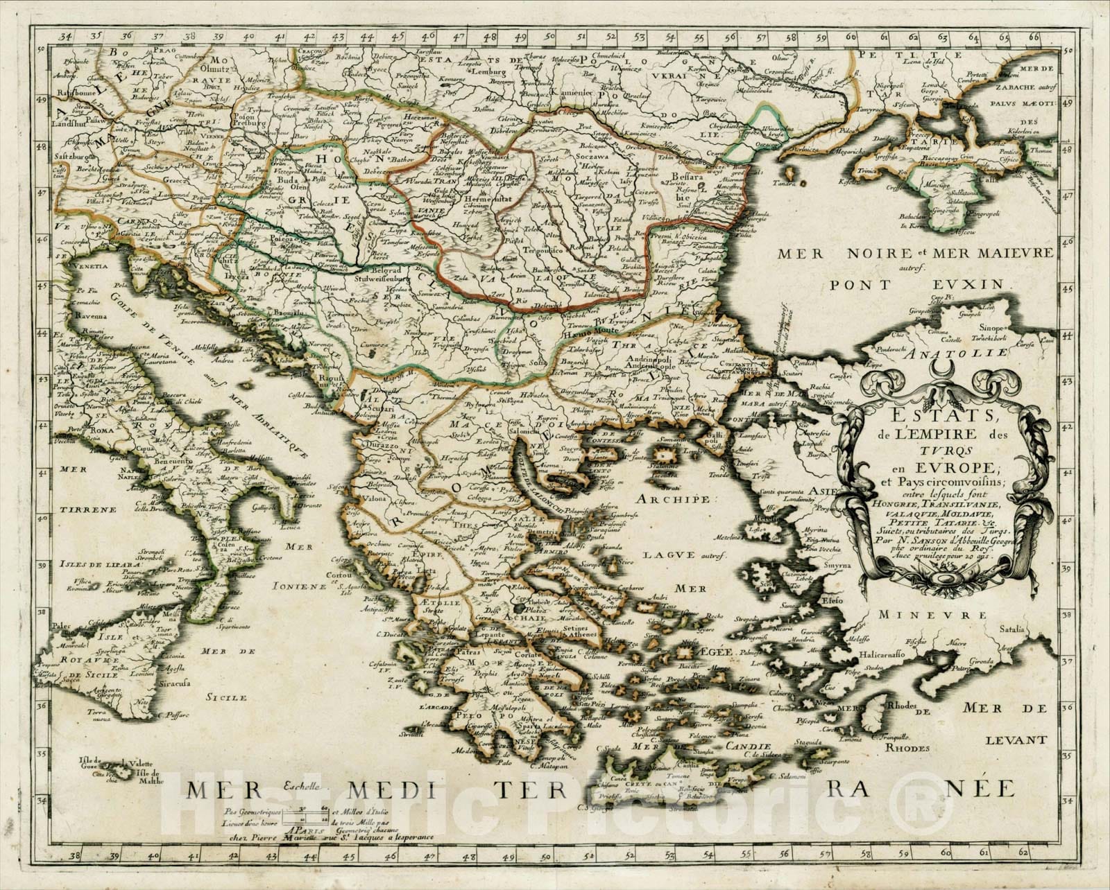 • .Historic Map : Estats De L'Empire Des Turqs en Europe; et Pays circomvoisins; entre lesquels sont Hongrie, 1655, , Vintage Wall Art