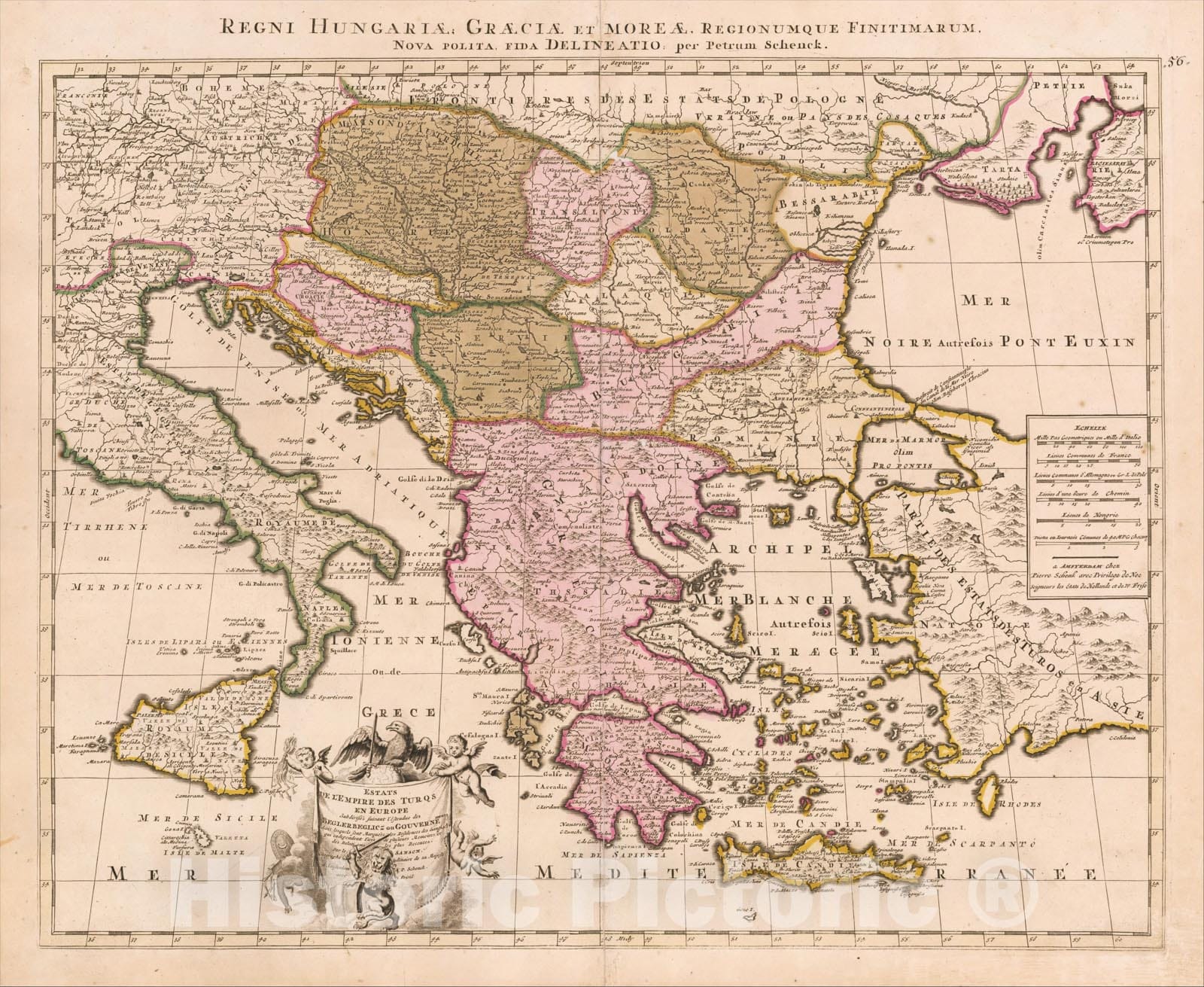 Historic Map : Estats de L'Empire des Turqs en Europe, Subdivisee Suivant l'Academie des Beglerbeglicz our Gouvernements, c1700, Peter Schenk, Vintage Wall Art