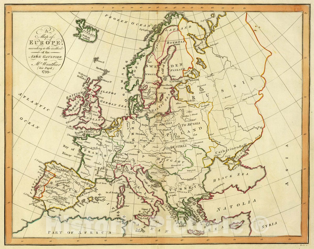 Historic Map : Europe, According to The Method of The Abbe Gaultier by Mr. Wauthier, his Pupil, 1799. Hewitt sc, 1799 Atlas - Vintage Wall Art