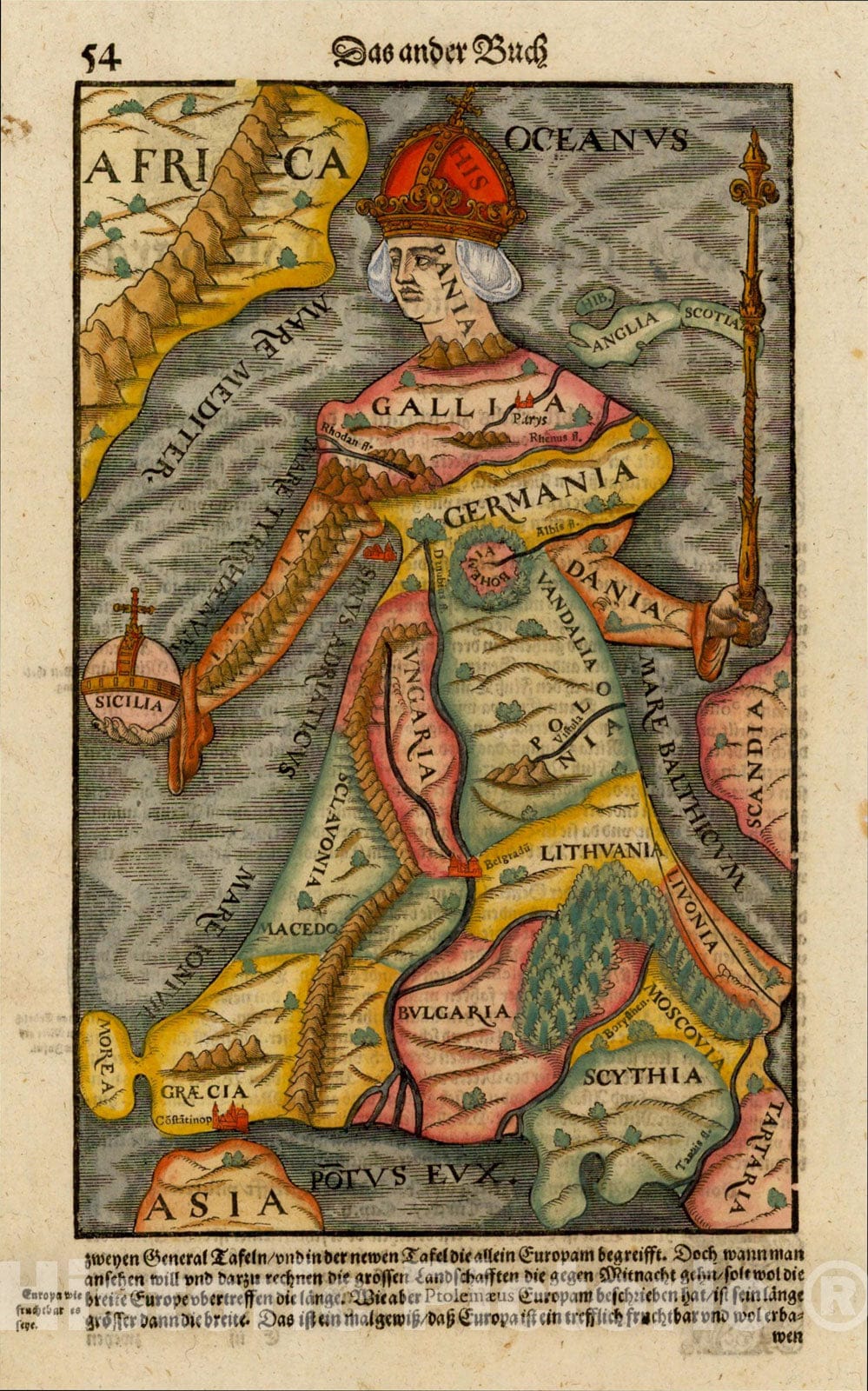 • .Historic Map : [Europe as a Queen], c1570, Sebastian M?nster, v2, Vintage Wall Art