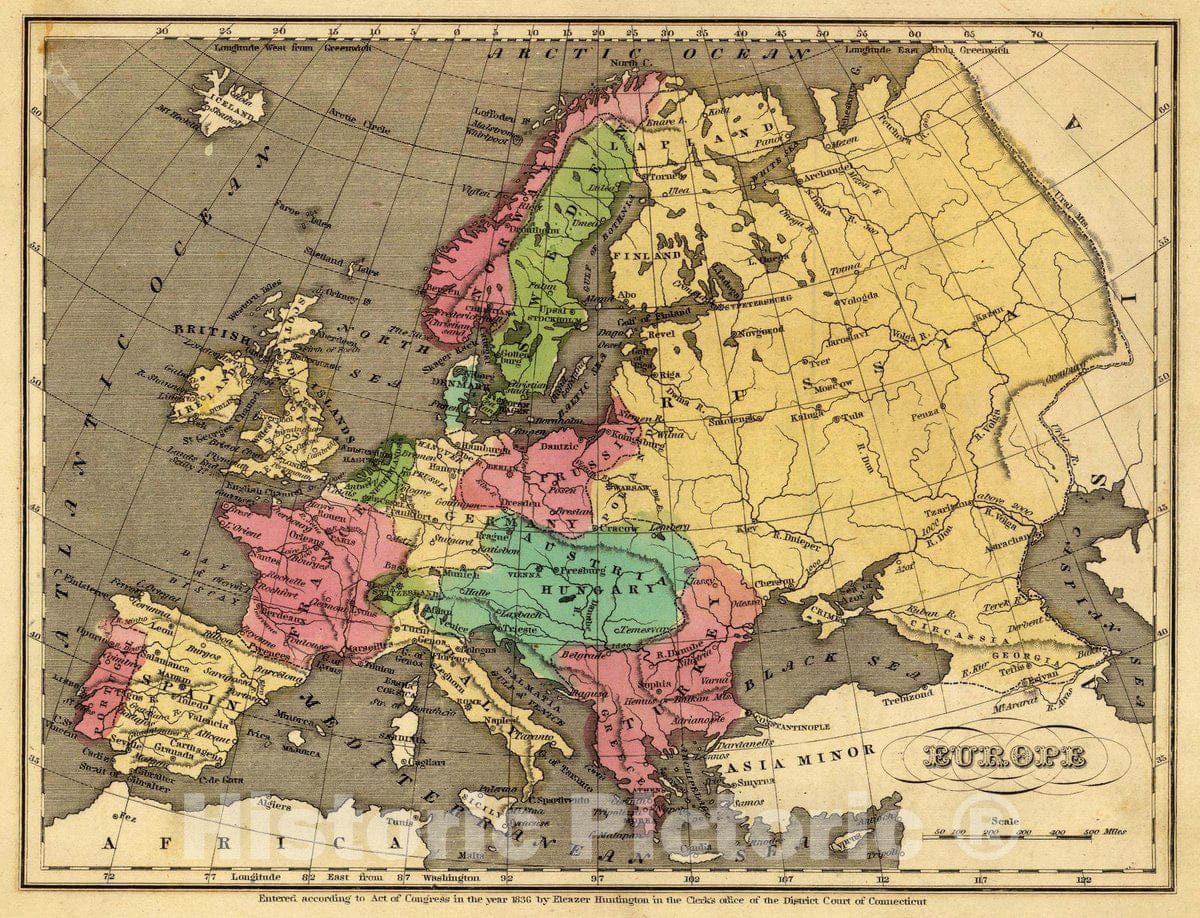 Historic Map : Europe. Entered 1836, by Eleazer Huntington Connecticut, 1836 Atlas - Vintage Wall Art