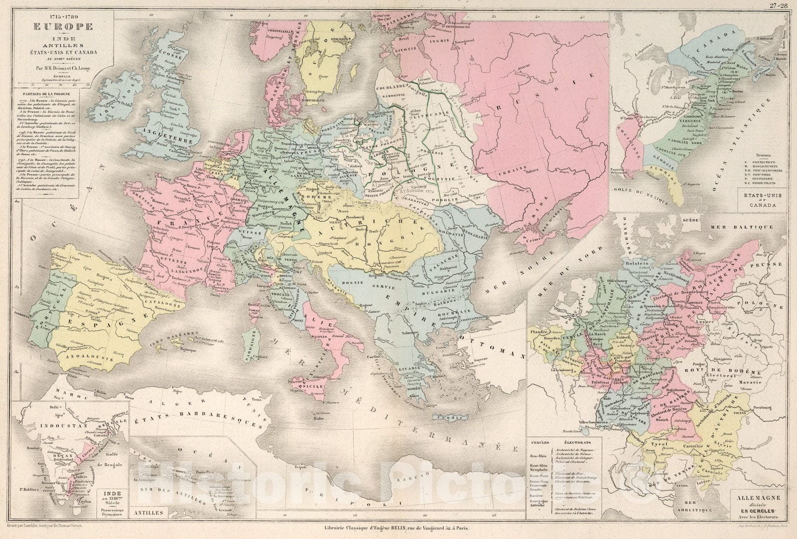 Historic Map : Europe : Inde, Antilles , Etats - Unis et Canada Au XVIIIe. siecle. 1715-1789, 1886, Vintage Wall Art