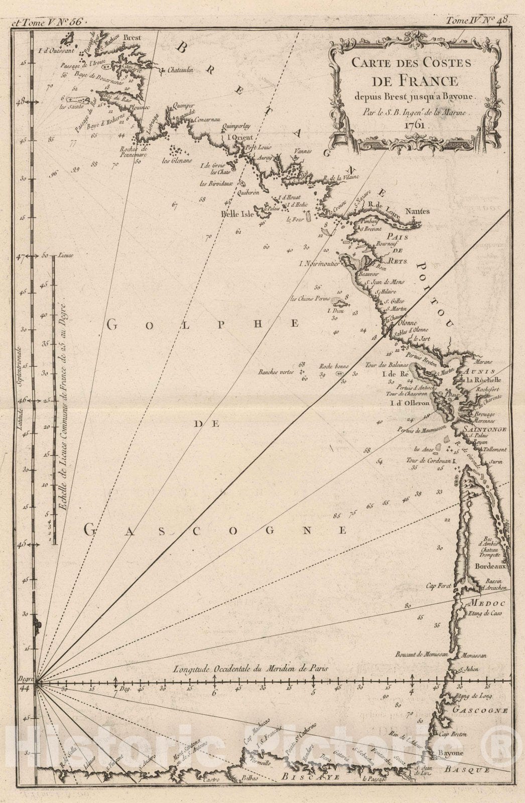 Historic Map : France, , Europe 1761 Carte Des Costes De France : depuis Brest jusqua Bayone , Vintage Wall Art