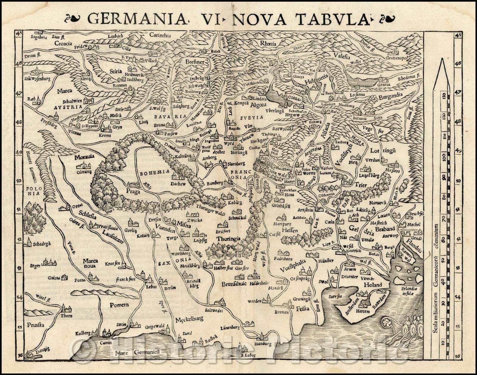 Germania VI Nova Tabula / Map of German Europe, with South oriented at the top of the Map, 1542, Sebastian M?nster