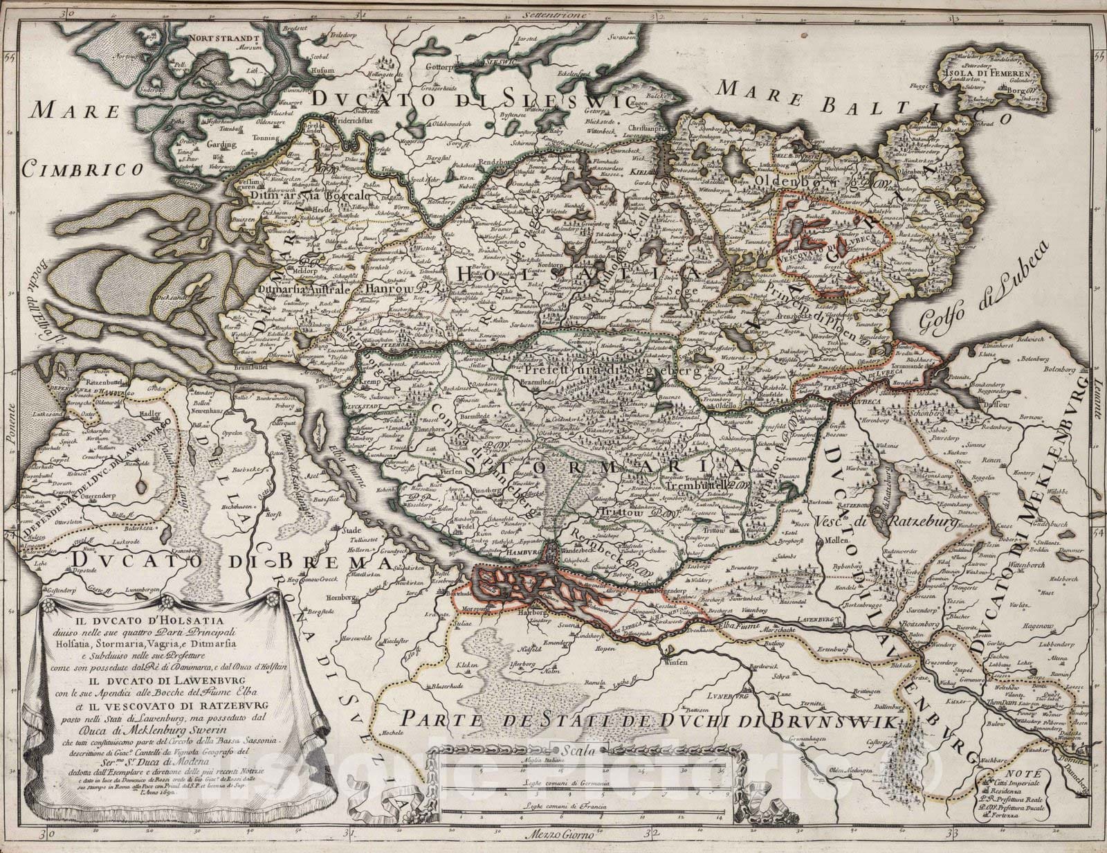 Historic Map : Germany, , Europe 1692 Il ducato d'Holsatia, Il Ducato di Lawenburg, et Il Vescovato di Rsatzaburg , Vintage Wall Art