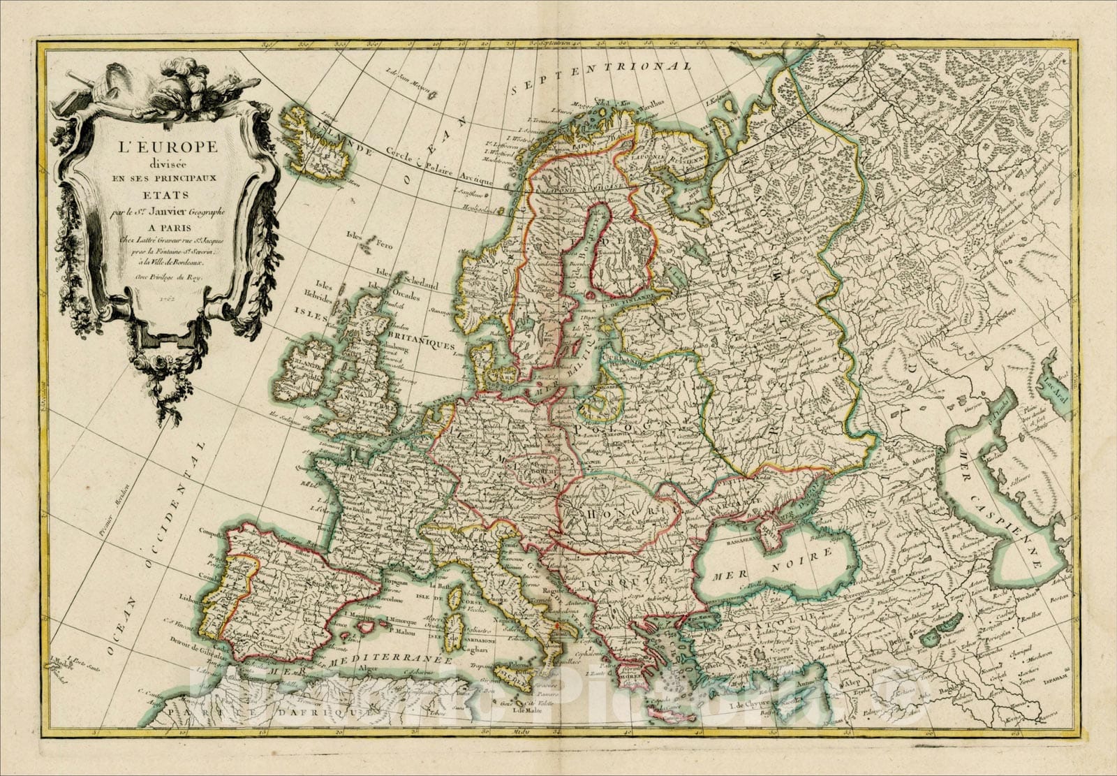 • .Historic Map : L'Europe divisee En Ses Principaux Etats, 1762, 1762, Jean Janvier, Vintage Wall Art