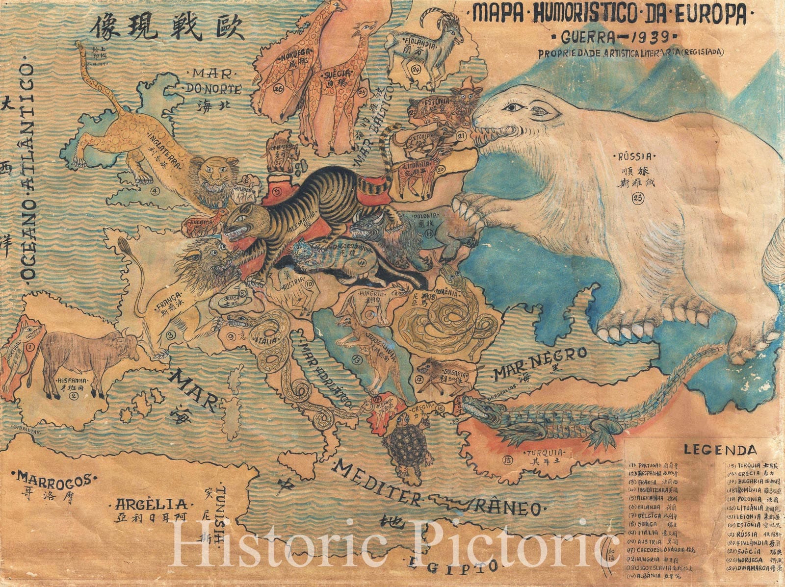 Historic Map : Portuguese and Chinese Manuscript Satirical Map of Europe in 1939 "WWII", 1939, Vintage Wall Art