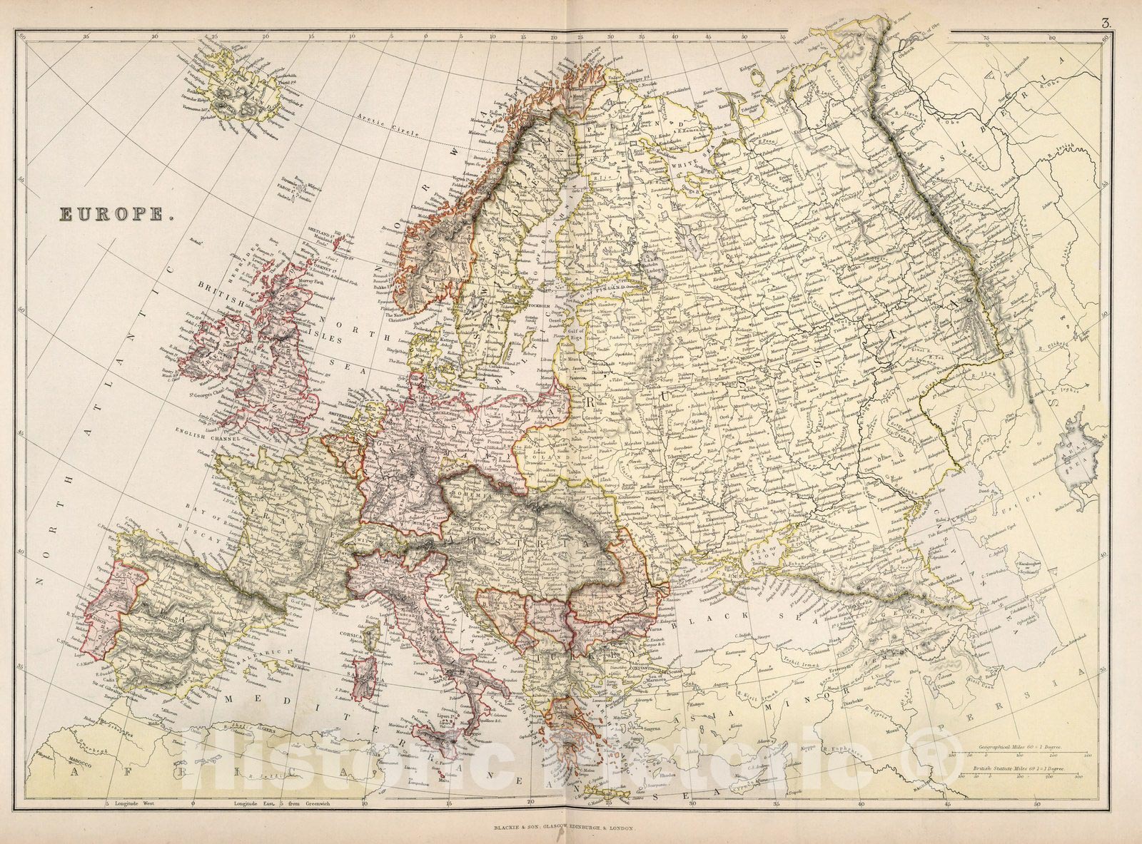 Europe. | The Comprehensive Atlas & Geography Of The World: Comprising An Extensive Series Of Maps, A Description, Physical And Political, Of All The Countries Of The Earth; A Pronouncing Vocabulary Of Geographical Names, And A Copious Index Of Geographical Positions ... Compiled And Engraved From The Most Authentic Sources, Under The Supervision Of W.G. Blackie Ph.D., F.S.A. Scot. ... B. & S. Lucem Libris Disseminamus. London: Blackie & Son, 49 & 50 Old Bailey, E.C.; Glasgow, Edinburgh, And Dublin. 1882. (on verso) Glasgow: W.G. Blackie And Co., Printers, Villafield. | The color litho maps are by Edward Weller. Ten color litho plates illustrate the races of mankind. Extensive text. Relief shown in hachures. Full color. Gilt edging on pages.