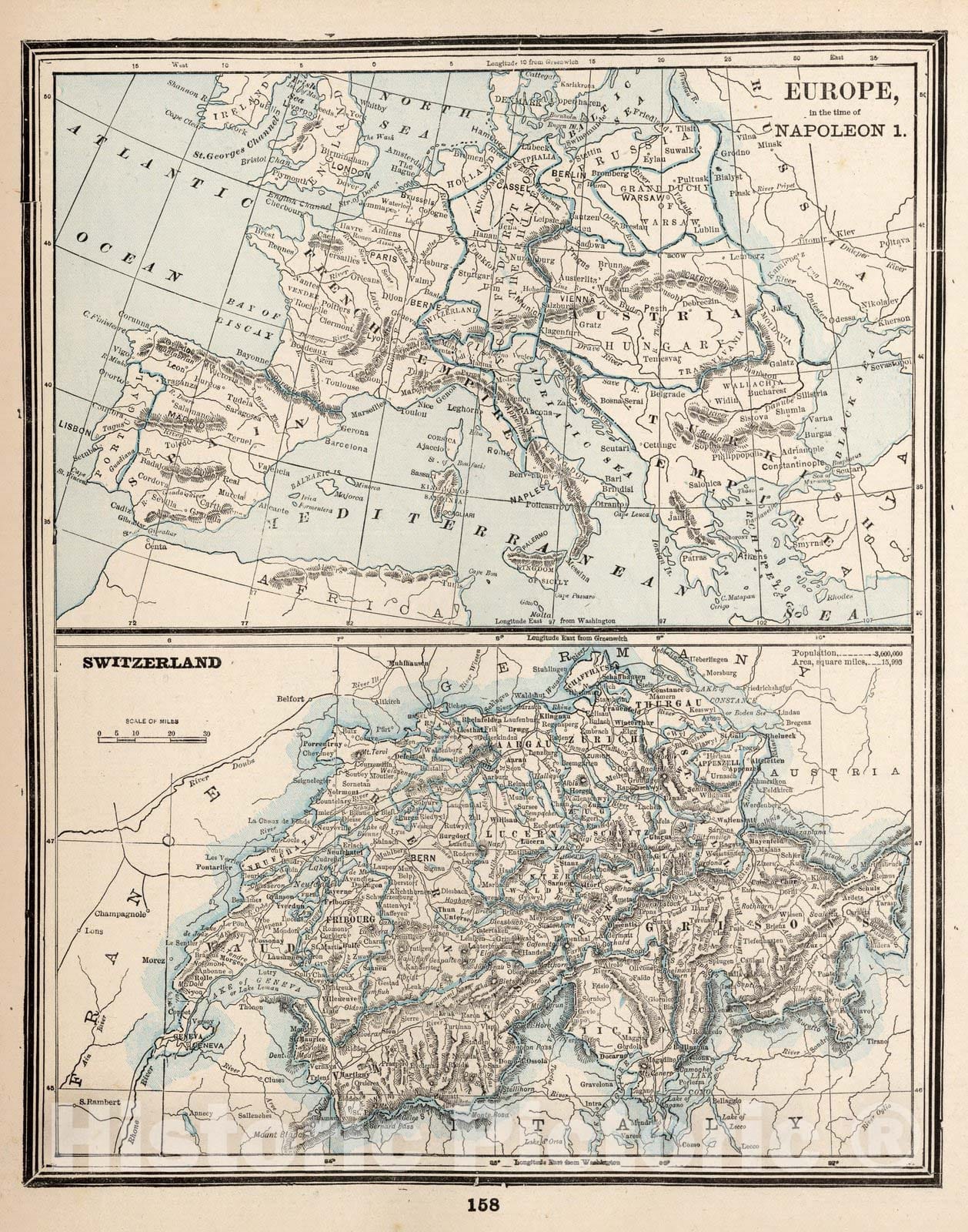 • .Historic Map : World Atlas Map, Europe in the time of Napoleon 1. Switzerland 1893 - Vintage Wall Art