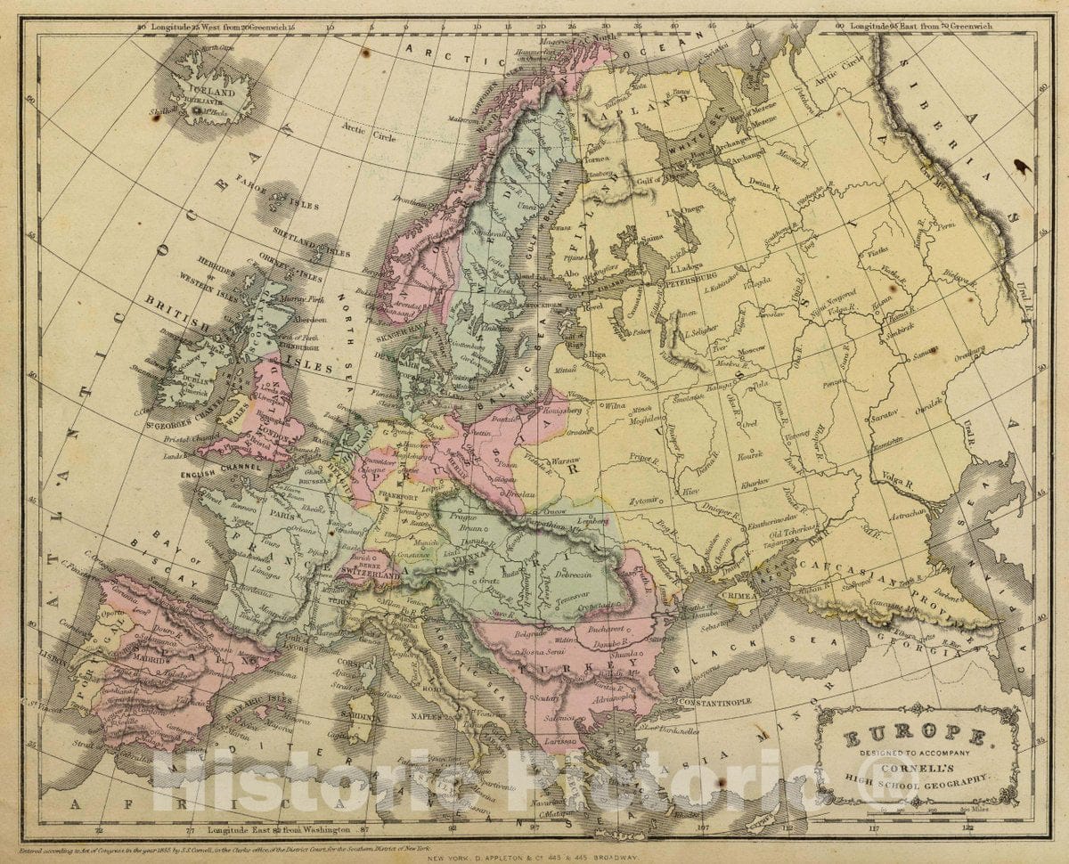 • Historic Wall Map : Europe. Designed to accompany Cornell's High School Geography, 1864 Atlas - Vintage Wall Art