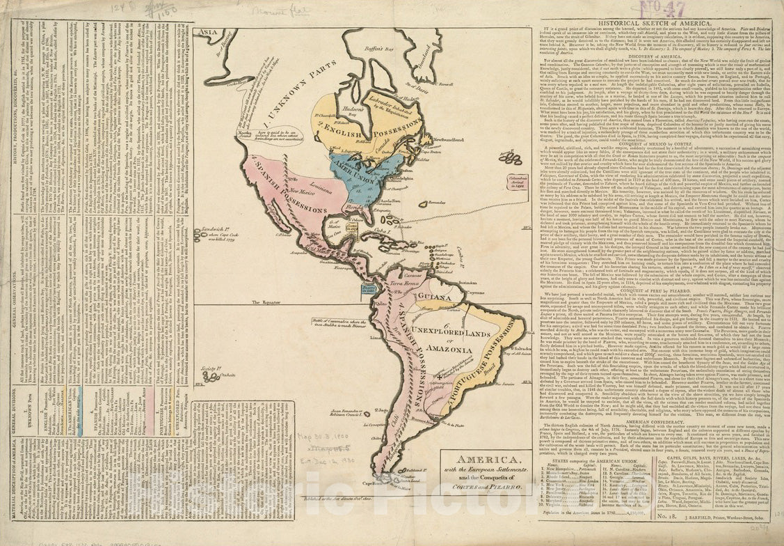 Historical Map, 1800 America, with The European Settlements, and The conquests of Cortes and Pizarro, Vintage Wall Art