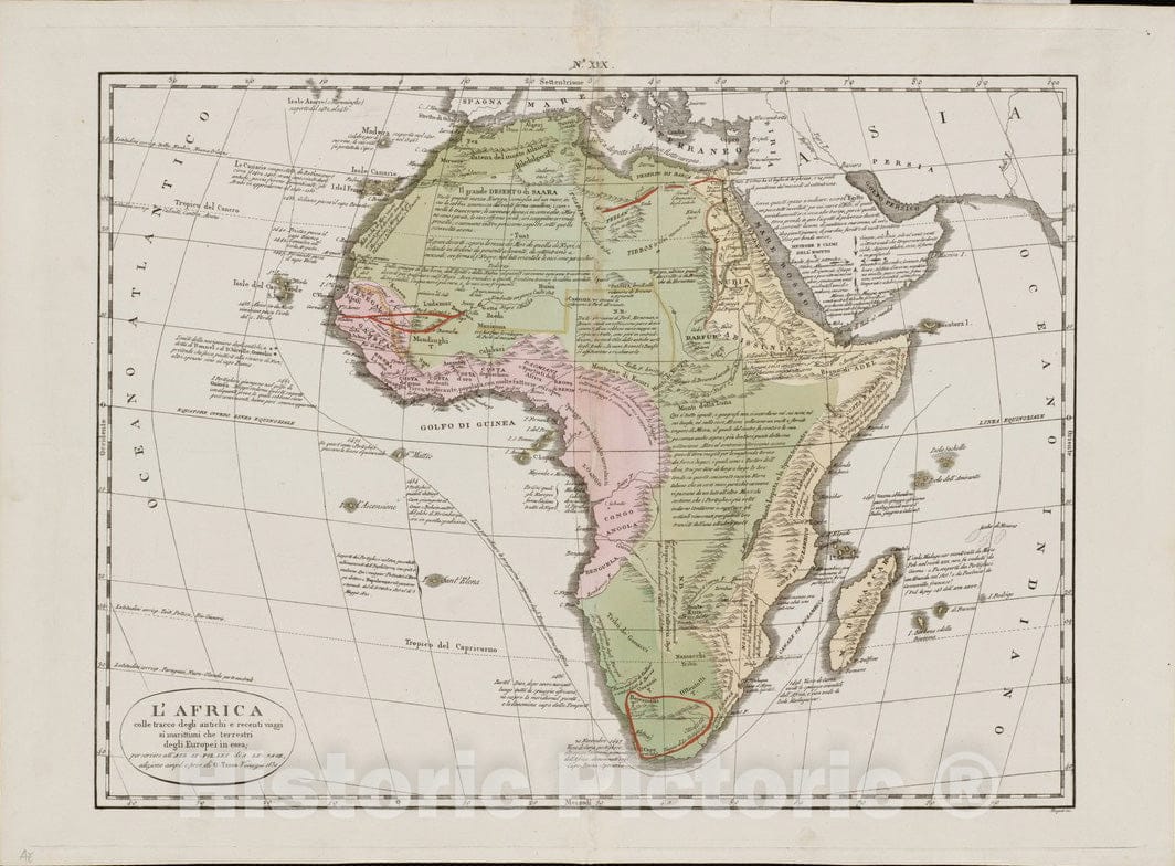 Historical Map, 1830 L'Afrique, Colle tracce Degli antichi e recenti viaggi si marittimi Che terrestri Degli Europei in essa, Vintage Wall Art
