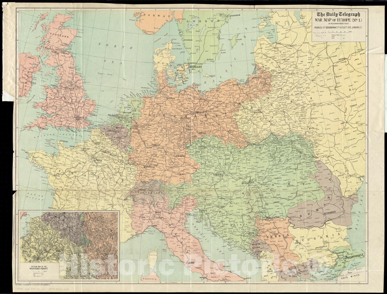 Historical Map, 1915 The Daily Telegraph war map of Europe (no. 1), Vintage Wall Art