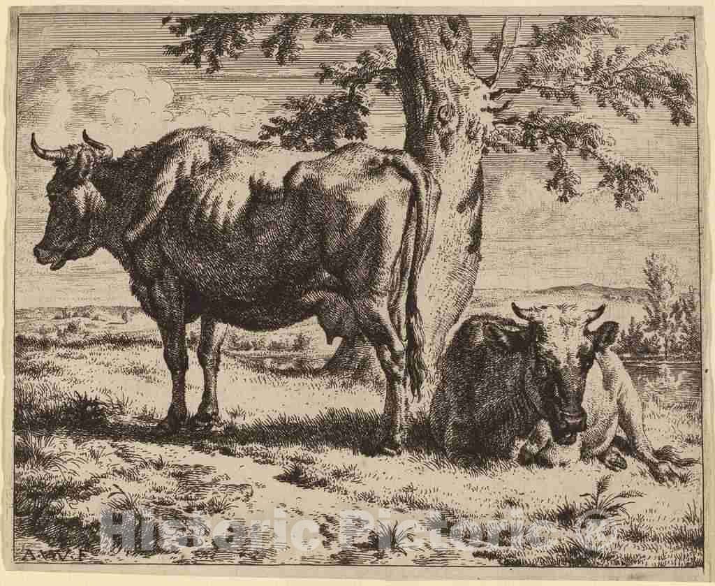 Art Print : Adriaen Van de Velde, Two Cows Under a Tree, c. 1670 - Vintage Wall Art