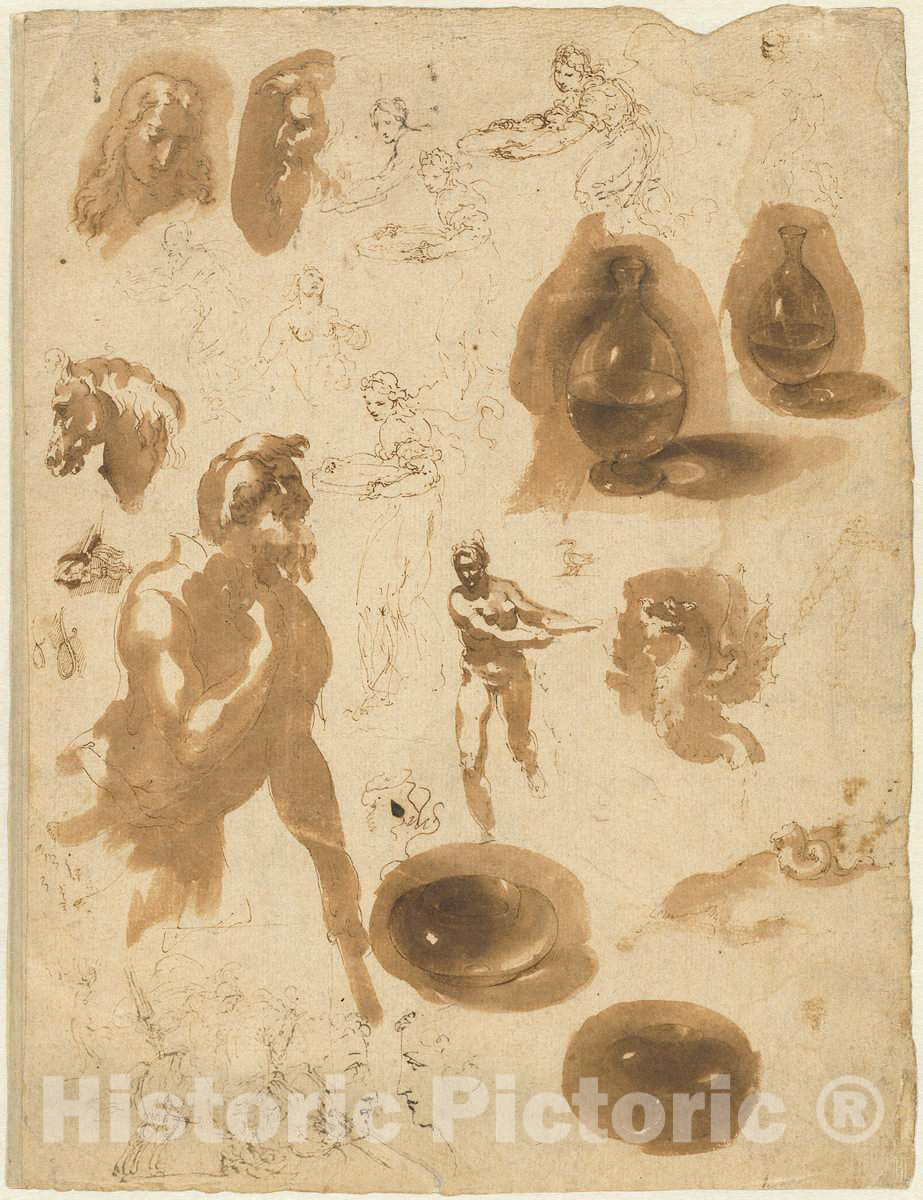 Art Print : Ambrogio Figino, Studies of Glass Jars and Figures (Recto), c. 1586 - Vintage Wall Art