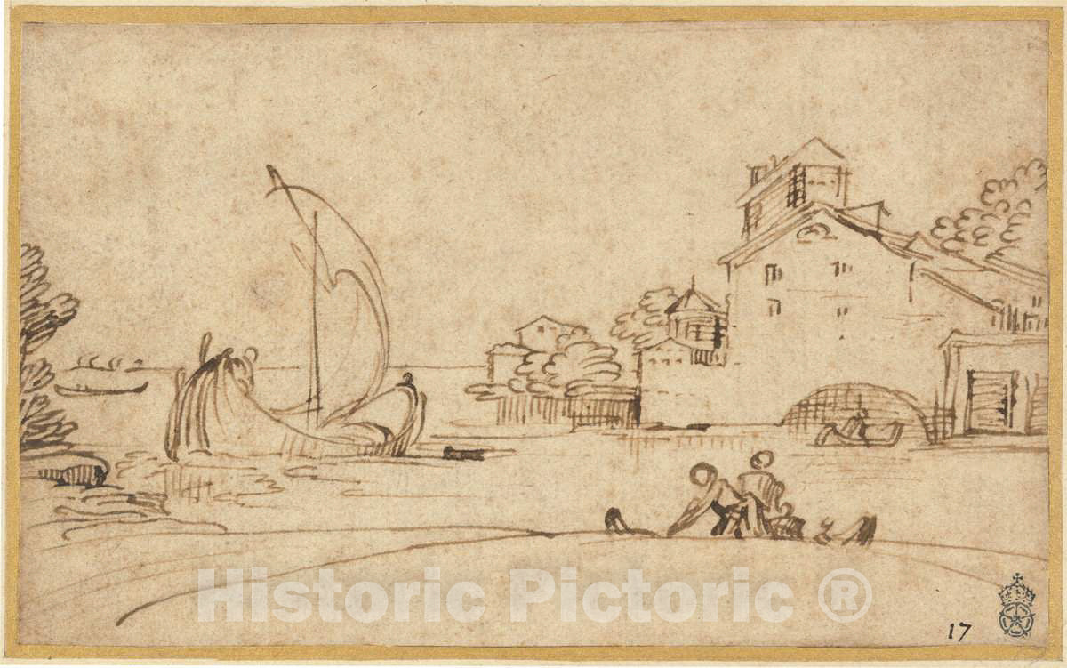 Artist: Annibale Carracci | Drawing: Landscape with Figures by an Estuary with Sailing Boats | Original Medium: pen and brown ink on laid paper; laid down