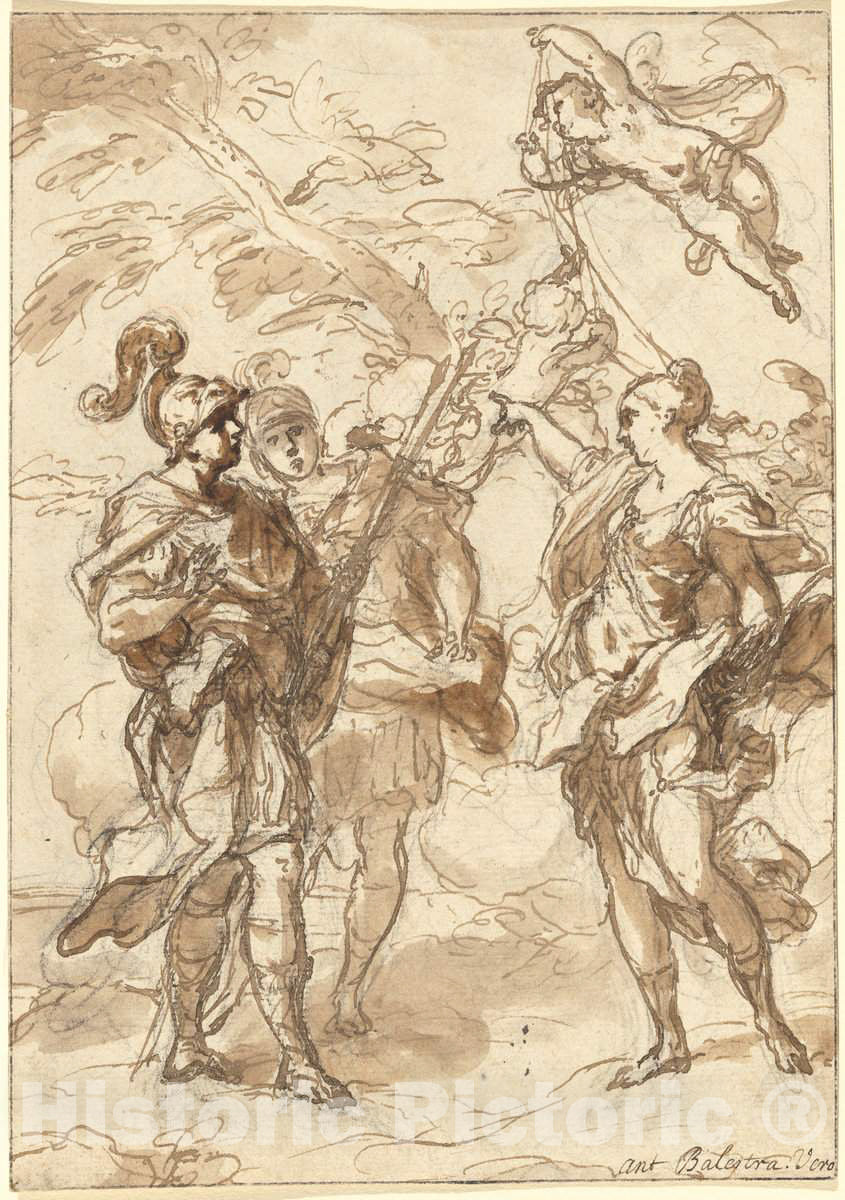 Artist: Antonio Balestra | Drawing: Venus as a Huntress Appearing to Aeneas and Achates | Original Medium: pen and brown ink with brown wash over black chalk on laid paper, traces of red chalk upper left