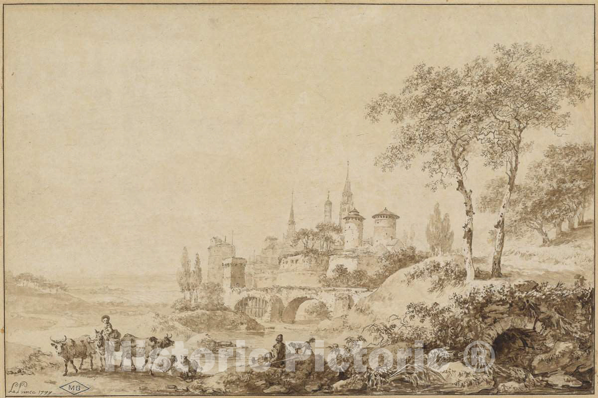 Art Print : Baptiste Le Prince, Shepherds in a Landscape Before a Fortified Town, 1777 - Vintage Wall Art