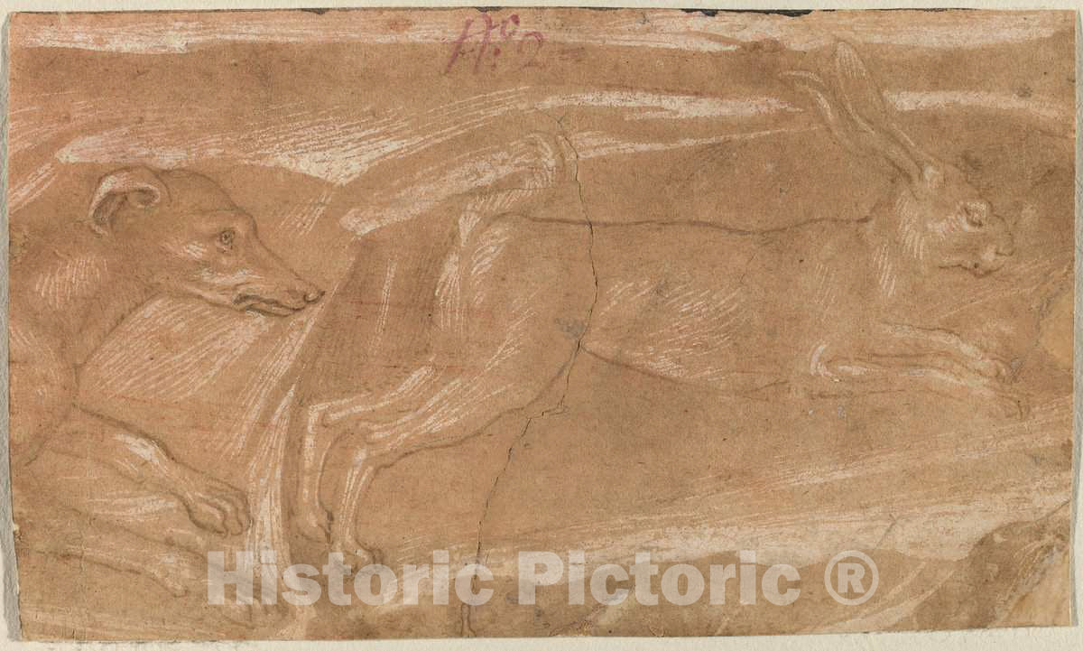 Artist: Benozzo Gozzoli | Drawing: A Hound Chasing a Hare | Original Medium: pen and brown ink with traces of red chalk, heightened with white on pink prepared paper