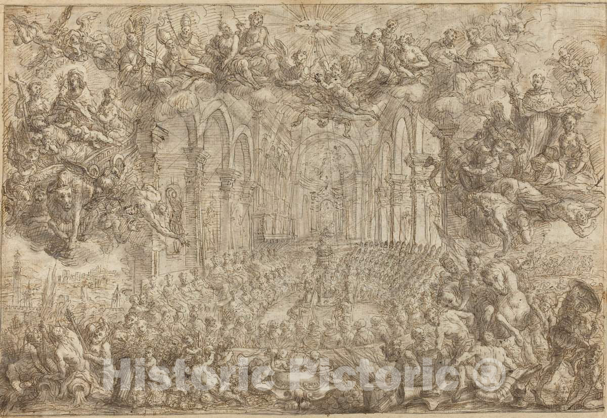 Artist: Biagio Falcieri | Drawing: The Council of Trent with Saint Thomas Vanquishing the Heretics | Original Medium: pen and black and brown ink and gray wash over black chalk on laid paper