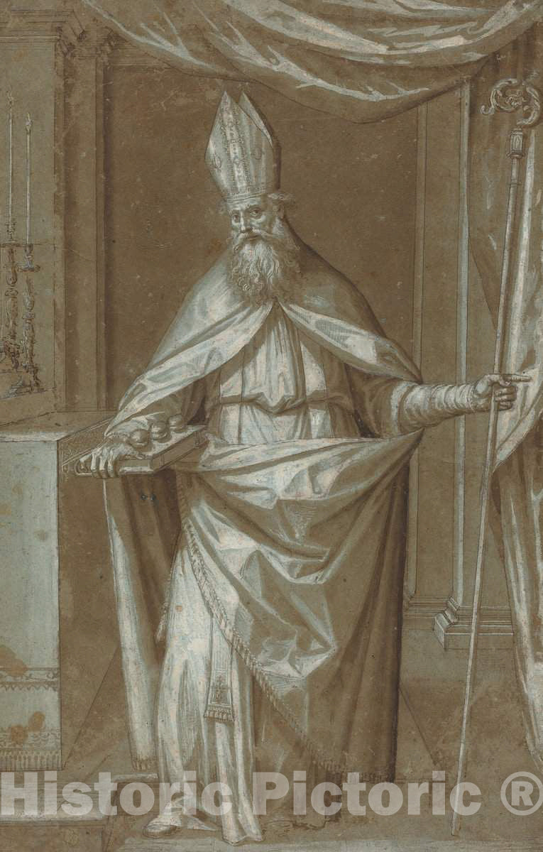 Artist: Attributed to Cesare Aretusi | Drawing: Saint Nicolas of Bari | Original Medium: pen and brown ink with brown wash and white heightening over graphite on blue paper