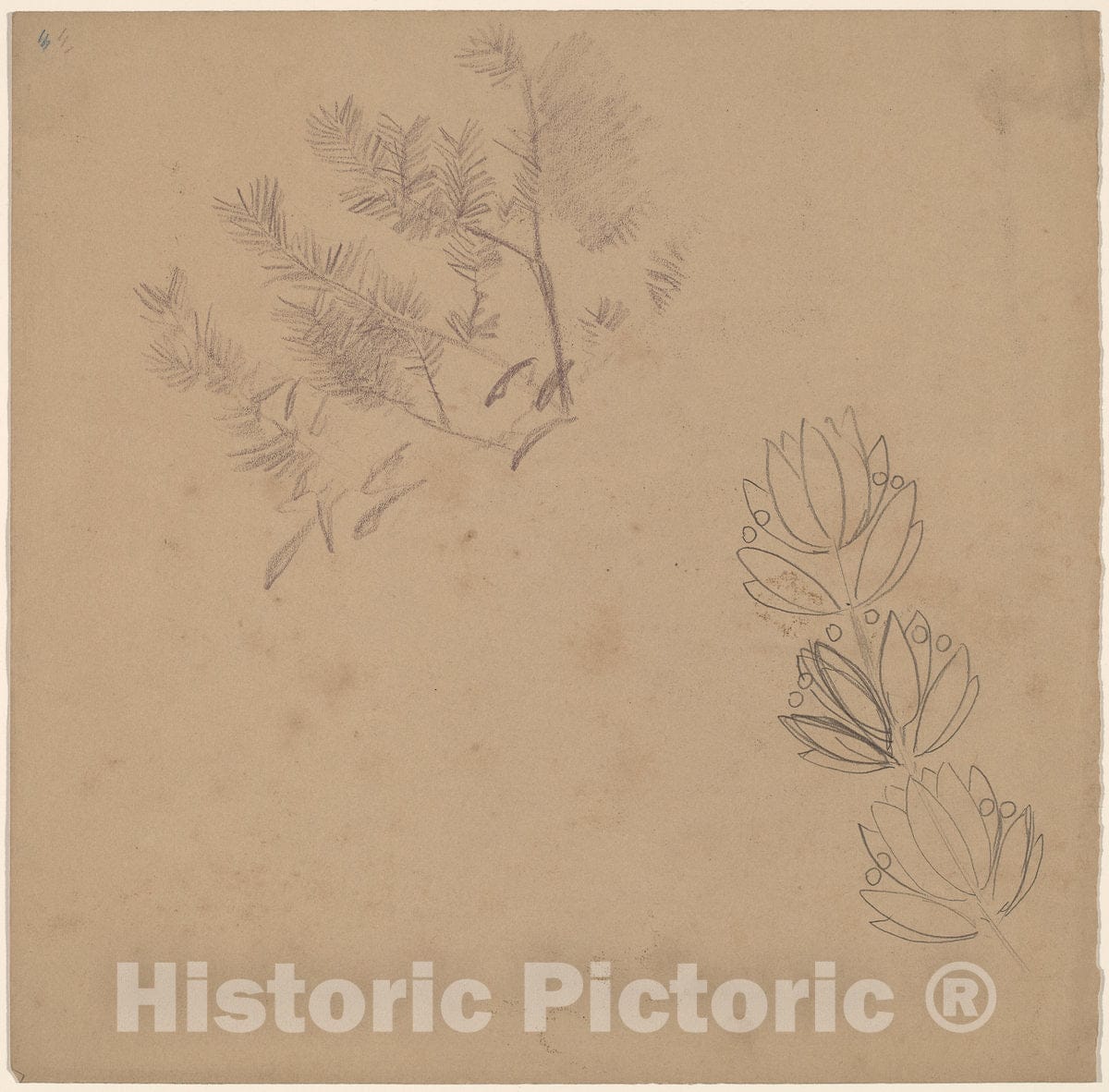 Artist: Charles Sprague Pearce | Drawing: Study for a Border Design with a Sketch of a Tree | Original Medium: purple pencil and graphite on brown wove paper