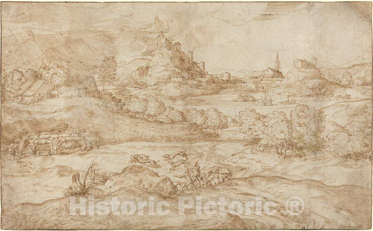 Art Print : Domenico Campagnola, Landscape with Shepherds Driving Away a Wolf, c. 1540 - Vintage Wall Art